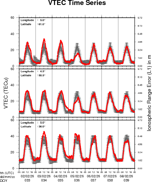 VTEC time series at 3 locations in Europe from 2 Feb 2026 till 8 Feb 2026