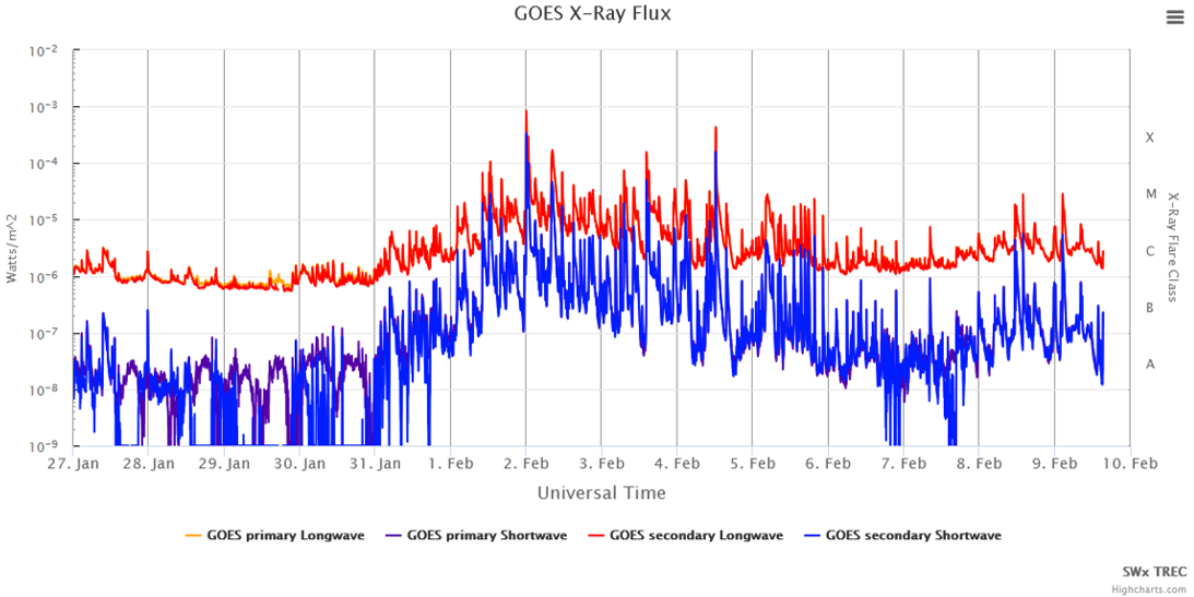 The passage of NOAA 14366 over the solar disk has not gone unnoticed, as extensively discussed in these STCE newsflashes at https://www.stce.be/news/803/welcome.html This can best be seen in the GOES soft-x-ray curve underneath (LASP/University of Colorado - https://lasp.colorado.edu/space-weather-portal/now ). As soon as this sunspot group started to develop on 31 January, there was also a strong increase in the recorded soft x-ray flux as well as in the number of produced solar flares. So far, this active region has produced 66 M- and 6 X-class flares (see "flare classes" at https://www.stce.be/educational/classification#xray ). Most of this flare activity took place between 1 and 5 February, with a little burp on 8 and 9 February. In fact, the very large majority of the M- and X-class peaks in the graph can be attributed to enhanced activity in NOAA 14366.