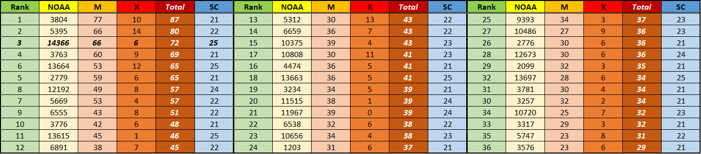 It's no surprize then that this sunspot group has been the most prolific M- and X-class flare producer so far this solar cycle (SC25). Though it has not produced as many X-class flares as the famous active region NOAA 13664 in May 2024, it is on top for the other flare statistics. The table underneath shows the Top 36 of active regions (NOAA number) that have produced the most M- and X-class flares. Also the solar cycle (SC) to which they belong has been mentioned. Note that all the flare intensities prior to SC25 have been upscaled by a factor 1.43 to allow comparison of the flare numbers on equal footing with the current GOES measurements (see the NOAA/SWPC note https://ngdc.noaa.gov/stp/satellite/goes/doc/GOES_XRS_readme.pdf ). Following an analysis of the flaring statistics as recorded by the GOES family during the last half century, NOAA 14366 occupies already the third spot! Only the famous NOAA 5395 in March 1989 and NOAA 3804 in July 1982 were able to produce more M- and X-class flares.