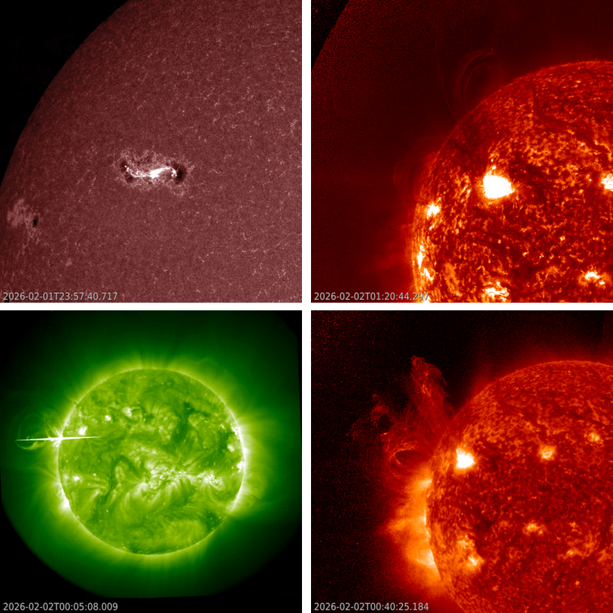 The strongest flare that NOAA 14366 has produced so far was the X8.1 late on 1 February. This is the third strongest so far this solar cycle, after the X9.0 flare produced by NOAA 13842 on 3 October 2024 (STCE newsitem at https://www.stce.be/news/727/welcome.html ) and the X8.7 by NOAA 13664 on 14 May 2024 (STCE newsitem at https://www.stce.be/news/700/welcome.html ). The compilation underneath shows this X8.1 flare as observed by 4 different spacecraft in the extreme ultraviolet (different wavelengths and zooms): SDO/AIA (upper left), GOES/SUVI (upper right), STEREO-A/EUVI (lower left) and Solar Orbiter/EUI (lower right). The latter two show the location of the eruption more to the east limb (left") because STEREO-A and Solar Orbiter are leading the Earth by respectively 51 and 15 degrees. The clips are in the online version of this newsitem at https://www.stce.be/news/805/welcome.html