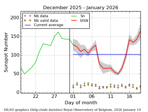 The daily Estimated International Sunspot Number (EISN, red curve with shaded error) derived by a simplified method from real-time data from the worldwide SILSO network. It extends the official Sunspot Number from the full processing of the preceding month (green line), a few days more than one solar rotation. The horizontal blue line shows the current monthly average. The yellow dots give the number of stations that provided valid data. Valid data are used to calculate the EISN. The triangle gives the number of stations providing data. When a triangle and a yellow dot coincide, it means that all the data is used to calculate the EISN of that day.