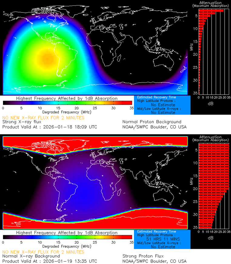 The x-ray and EUV radiation from the X1 flare affected the ionosphere on the dayside of the Earth, affecting the lower portion of the High Frequency radio communication (HF Com ; 3-30 MHz). Also the high proton flux is currently affecting HF Com, but this time almost over the entire HF range and only over the polar regions, a so-called Polar Cap Absorption (PCA). There's a chance that the PCA lasts until 20 and possibly even 21 January, and that HF radio communication over the polar caps is not possible during that timeframe. The D-RAP maps (NOAA ; https://www.swpc.noaa.gov/products/d-region-absorption-predictions-d-rap ) underneath show the impact of the flare (top) and proton event (bottom) on the HF Com, both location and intensity ("attenuation").