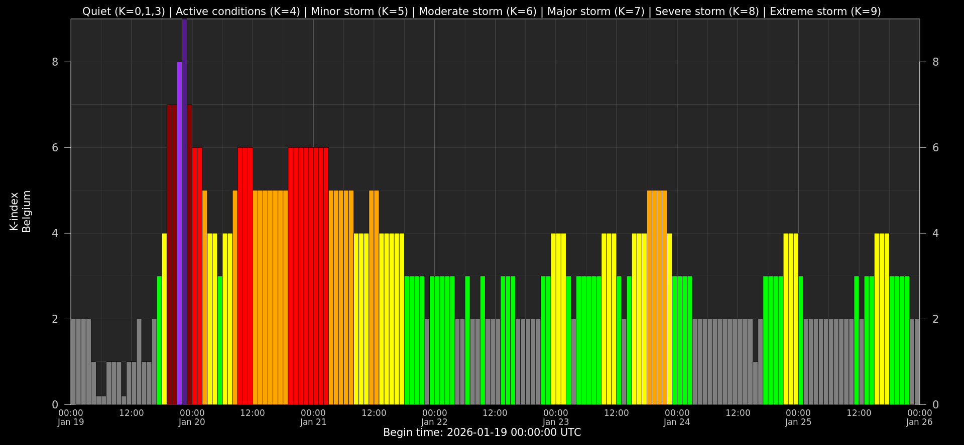 Geomagnetic conditions reached severe storm levels following the ICME impact and the strongly southward IMF. Globally, NOAA Kp reached 8 during the 18:00 to 21:00 UTC interval on January 19 and increased to 9- during 21:00 to 24:00 UTC. Locally, the Belgian K index (K BEL) rose rapidly, reaching 8 by 21:00 UTC and 9 by 22:00 UTC on January 19, indicating an extremely severe storm interval over Belgium. A further severe storm interval was reported globally (NOAA Kp 8-) during 06:00 to 09:00 UTC on January 20, after another prolonged period of negative Bz. Thereafter, geomagnetic activity gradually decreased, evolving from storm levels to mainly active and unsettled conditions by the end of the week.