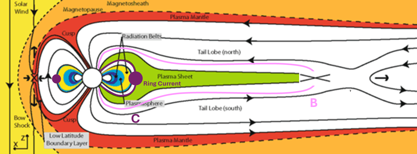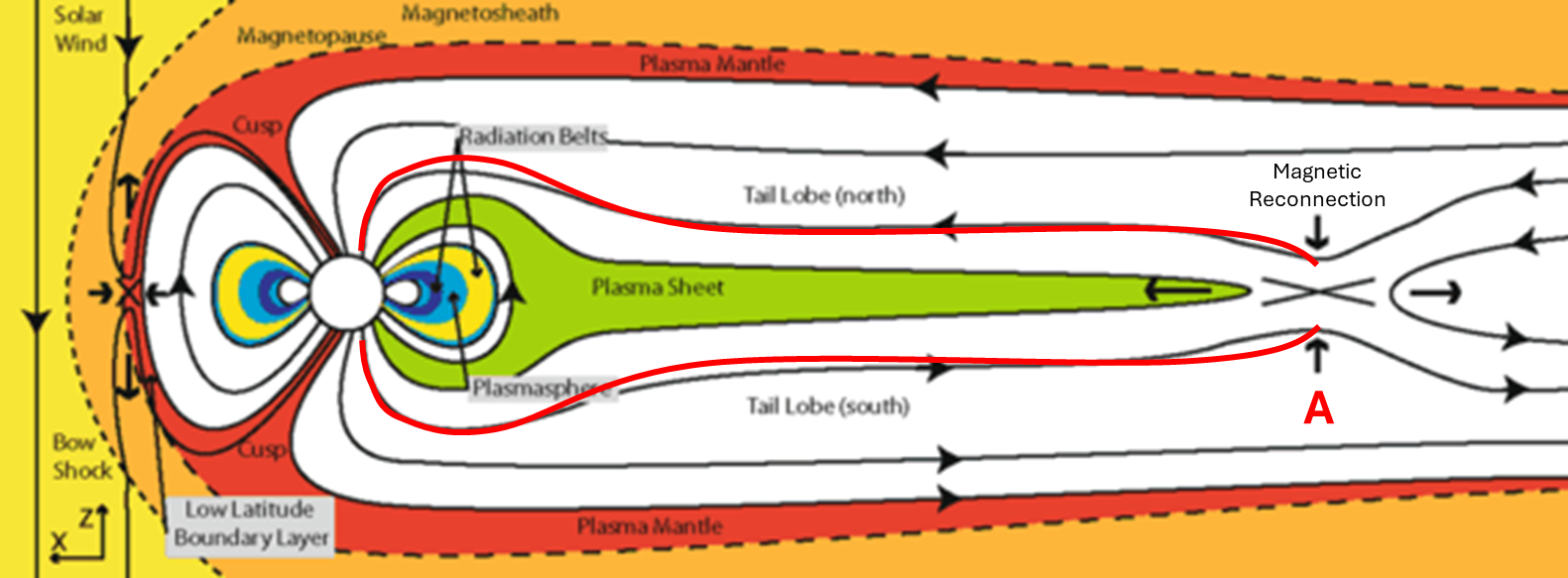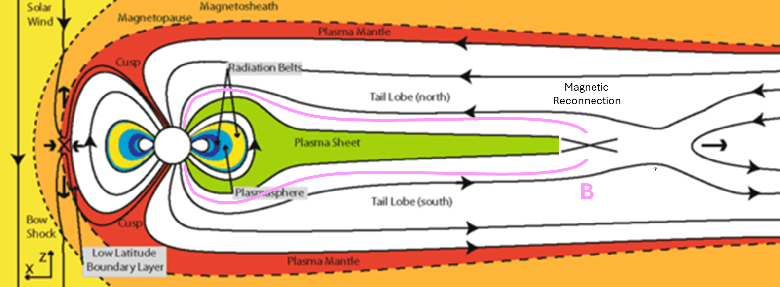 - When the magnetic field of the arriving CME has a southward pointing orientation, then a good connection with the geomagnetic field (dayside) is possible. As a result, the magnetotail (nightside) gets compressed by the passing CME. This pushes the two lobes of the magnetotail closer together. But as their magnetic field lines have an opposite direction, a "short-circuit" (magnetic reconnection) takes place, accelerating the particles (mostly electrons) violently to Earth. Under normal solar wind conditions, this magnetic reconnection occurs at distances in the range of 23 to 31 earth radii (Nagai et al. 2023 - https://doi.org/10.1029/2023JA032023 ).
