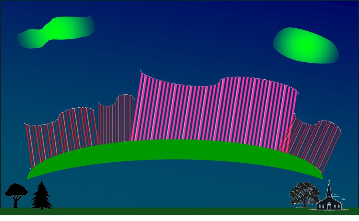 So where were those bright green blobs coming from during last week's storm? Those were clearly outside the location of the typical red and green aurora, appearing all the way up into the zenith and even a bit further southward as seen from Belgium. Well, the source of these aurora is not located in the magnetotail, but in the ring current. The ring current is an electric current encircling the Earth at geocentric distances between 3 to 8 earth radii (nightside) in the equatorial plane, partially overlapping with the outer radiation belt, as shown in the sketch of Figure 1.C. So, the ring current is even closer to the Earth than the locations of the magnetic reconnection of the "normal" aurora. During a particular strong geomagnetic storm, it may happen that interactions between the magnetic waves and the protons present in the ring current, move those protons out of the ring current such that they move along the magnetic field lines to locations even further equatorward than the typical aurora (see also Xiao et al. 2014: https://www.nature.com/articles/srep05190 ). There, these runaway protons collide with particles from the upper atmosphere and cause those pulsating green blobs, called "proton aurora". Appearing much higher in the sky than the usual aurora (Figure 2.C.), these green patches brighten and fade in a matter of tens of seconds.