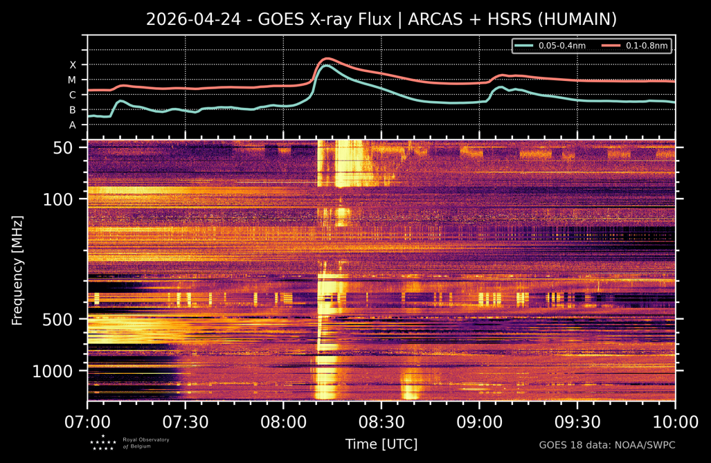 The radio signature of the second X-class flare was also observed by the Humain Radioastronomy Station in Belgium, as can be seen in the radio spectrogram underneath. The horizontal axis represents time increasing from left to right and the vertical axis represents frequency (in MHz) decreasing upward to represent the decreasing density with increasing altitude in the solar atmosphere. The evolution of the solar soft-x-ray flux (GOES) is displayed on top of the spectrogram.