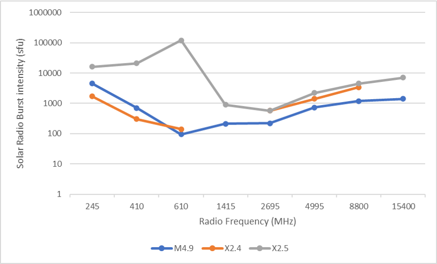 Radio observations by the NOAA/USAF network revealed that all 3 flares discussed above were associated with a Castelli-U burst (or U-burst for short). It was named after John Castelli, a military in the USAF (United States Air Force) who worked extensively in the radar and radio domain during World War II and in the 1950-70’s. This "Castelli-U spectral burst" is characterized by a U-shape in a graph depicting the intensity of the burst vs. the observed radio frequencies, i.e. the highest intensities are usually found at frequencies below +/- 1000 MHz and above a few thousand MHz, and a dip in-between (Castelli et al. 1967 ; Castelli et al., 1977). This can be seen in the graph below showing all three flare events, based on data from the NOAA/USAF network. The Castelli-U feature requires a specific set of conditions, usually only satisfied with strong flares (see e.g. Chertok et al. 2009 ; Grechnev et al. 2008). Details, conditions, and further explanations can be found at https://www.spaceacademy.net.au/env/sol/solradp/solradp.htm (at the bottom of the page).