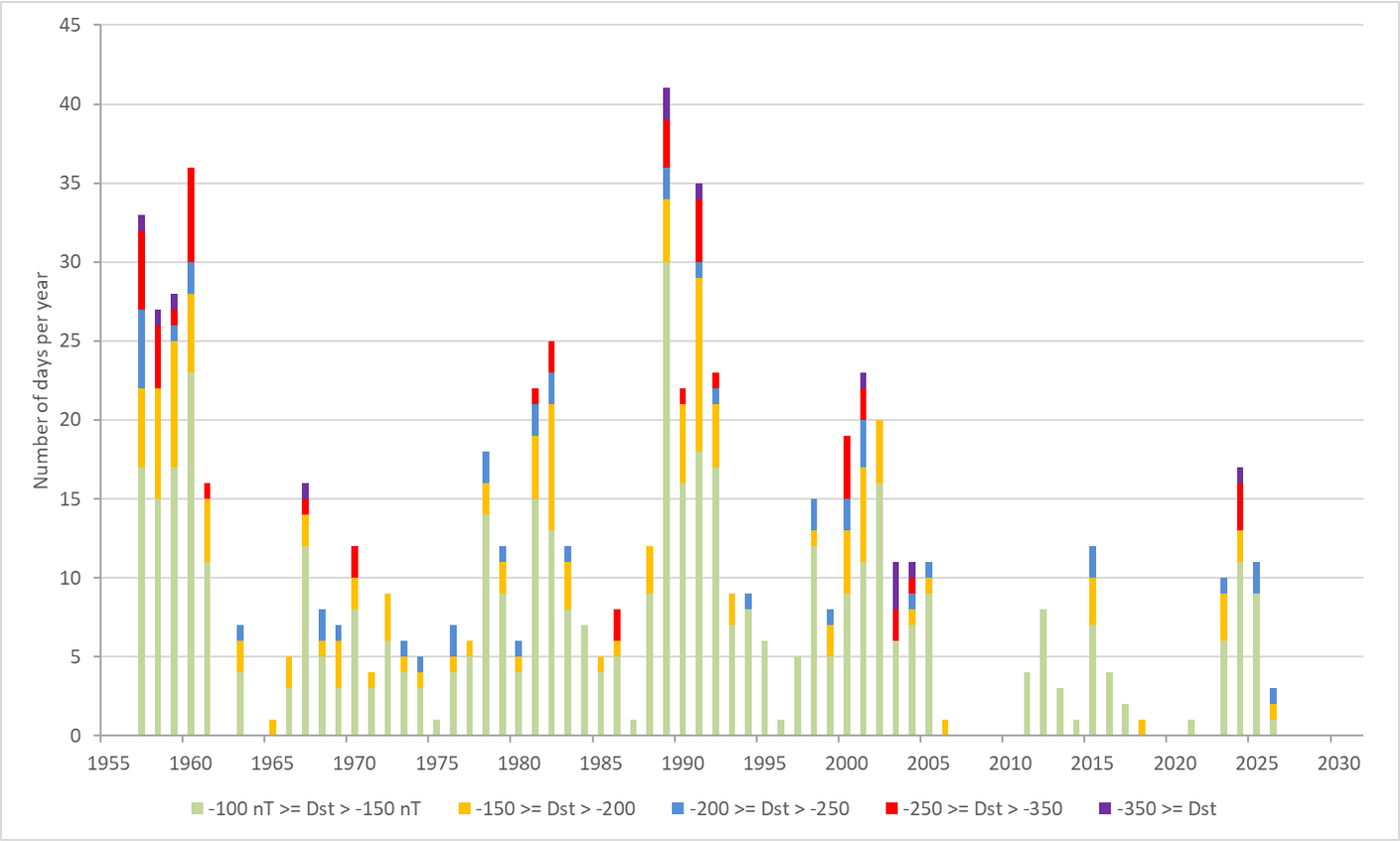 Since its inception in 1957, there have been around 700 days with at least one 1-hour interval during which the Dst index reached -100 nT or lower (more negative, i.e. stronger). These numbers have been grouped in 5 bins, as displayed in the graph above. There are only 13 days when a Dst < -350 nT was reached. Note the very weak SC24. So far, SC25 has 42 entries in this graph. Strong events took place on 23-24 April 2023 (Dst = -213 nT), 12 August 2024 (-188 nT), 10-11 October 2024 (-333 nT), 1 January 2025 (-212 nT) , 12 November 2025 (-217 nT) , and 20 January 2026 (-236 nT).