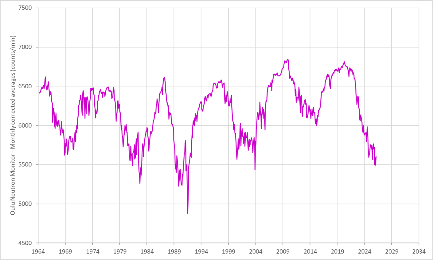 The graph above shows the evolution of the (unsmoothed) monthly neutron count (counts/minute ; corrected for air pressure and efficiency) as monitored by the Cosmic Rays station of the University of Oulu, Finland. This station has one of the longest running databases for this parameter, starting in 1964. Current evolution of the neutron counts (decreasing) shows the effect of the increased solar activity of the last few years, thus keeping more of the cosmic rays away from the Earth.