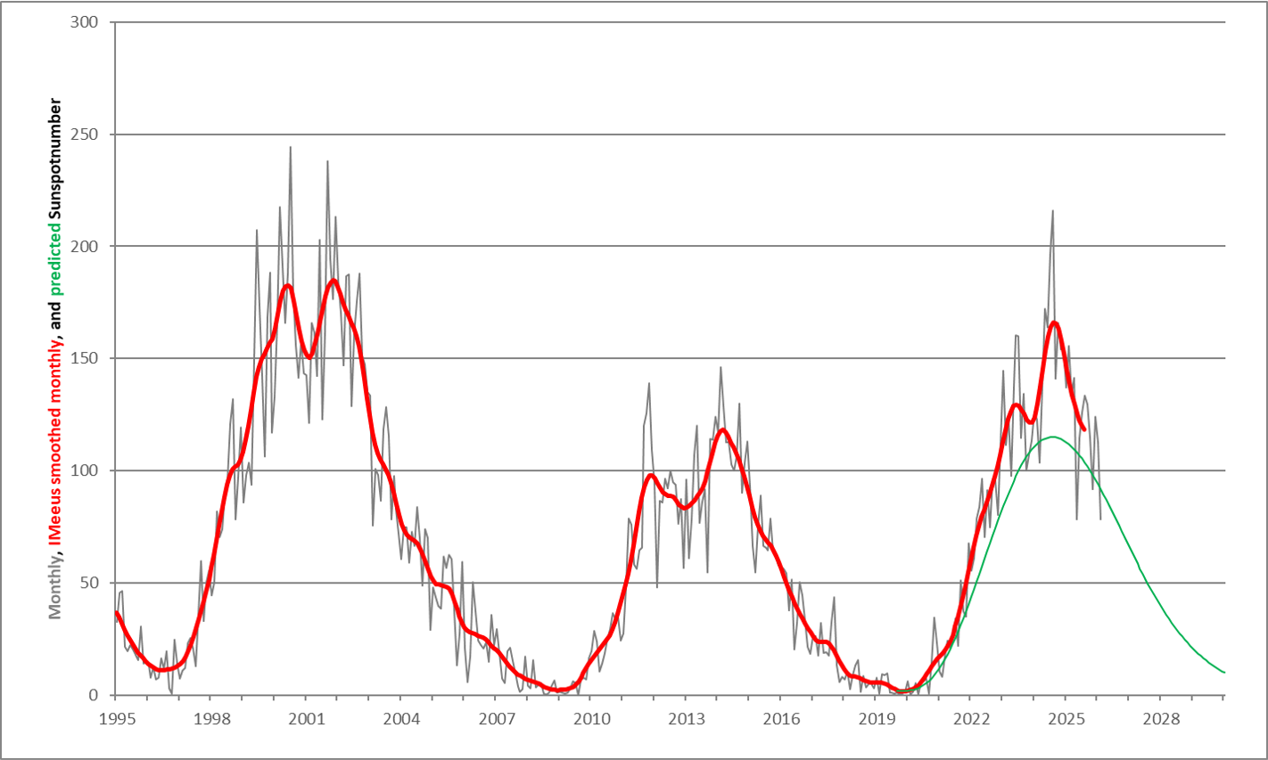 Following a surge in solar activity during the first half of 2023, the smoothed monthly sunspot number reached a first maximum of 125.3 in June 2023, thus exceeding already the maximum of the previous solar cycle SC24 (116.4). After a brief and mild decrease (Meeus smoothed graph), the smoothed monthly sunspot number increased again following the high sunspot numbers recorded from April 2024 onwards. Both in April, July, August and December 2024, there were several days when the provisional daily sunspot number exceeded 250. On 18 July, the highest daily sunspot number so far has been recorded (290). The monthly sunspot number reached a maximum of 216.0 in August, which is the highest since September 2001 (238.2).