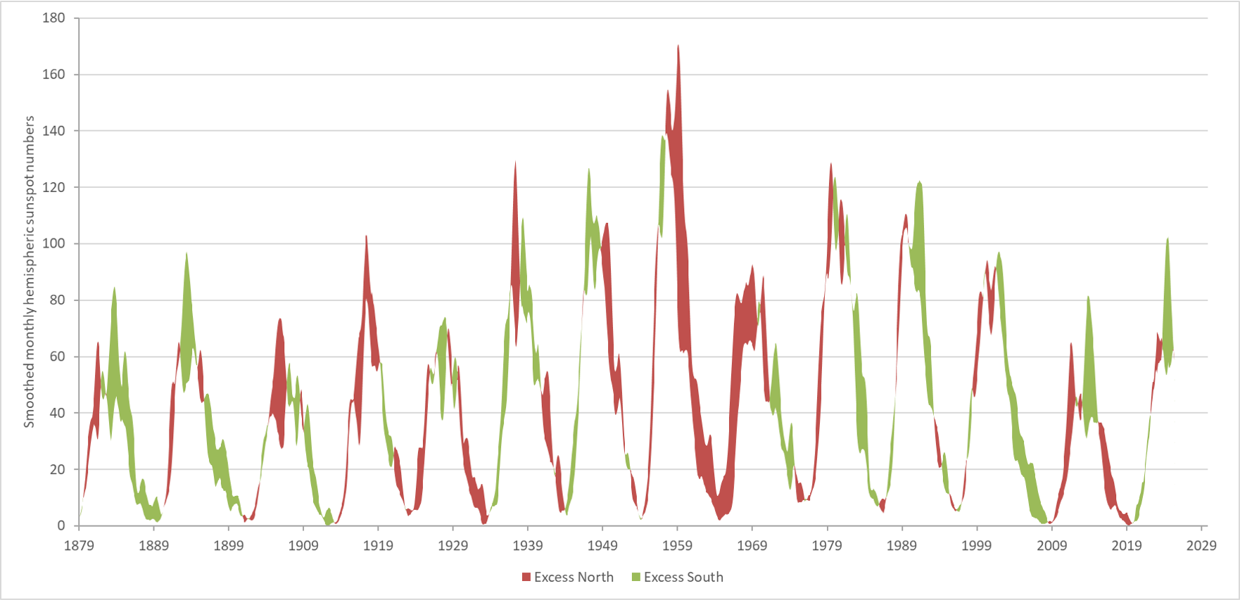 Similar to the sunspot area, a graph can be created for the evolution of the sunspot number of the solar hemispheres. These data are maintained by SILSO. Originally, these existed only for the last 3 solar cycles, starting in 1992 (See these SILSO datafiles). The newly extended hemispheric sunspot numbers series are based on the sunspot areas listed in the Greenwich photographic catalogue, and are calibrated on the existing SILSO reference hemispheric database (Veronig et al., 2021). In the graph above, "green" is indicating a dominating southern hemisphere, and "darkred" a dominating northern hemisphere. For obvious reasons, the graph is very similar to the one of the hemispheric sunspot area, albeit with subtle details. For example, the domination by the northern solar hemisphere from 2025 onwards is much less outspoken in the hemispheric sunspot numbers than in the hemispheric sunspot areas.