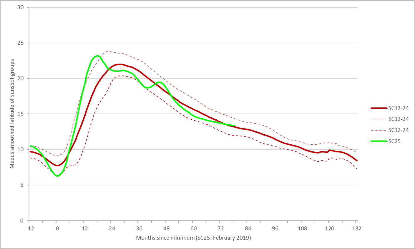 The graph above shows the smoothed (Meeus, 1958) average latitude of the sunspot regions from SC12 to 24 (brown; the thin dashed lines show the standard deviations), and for SC25 (green). The SC12-24 and SC25 latitudes are fit such that the months of lowest smoothed latitudes coincide (month "0").