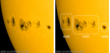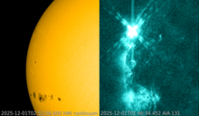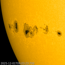 A giant sunspot region has rounded the southeast solar limb and has been the source of several M-class flares. The X-class event early on 1 December was produced by a smaller region near the northeast limb. Further strong flares are expected in the coming days.
