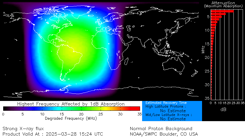 The X-class flare affected the lower frequency portion of the High Frequency communication band (HF Com ; 3-30 MHz) mainly over South-America, the Atlantic Ocean, the eastern portion of the USA, and the western portion of Europe and Africa. This can be seen on the D-RAP map underneath (NOAA/SWPC). An advisory to civil aviation has been issued (PECASUS/CRC).