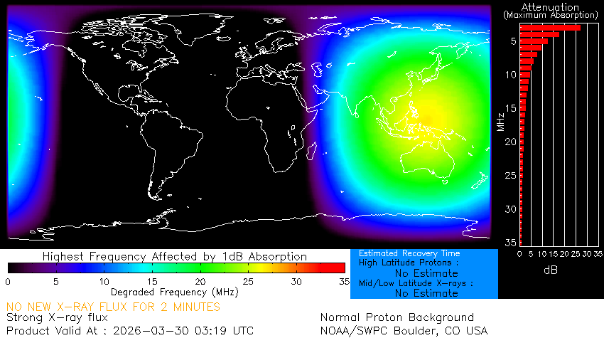 The ionizing radiation of the X-class flare itself affected the lower frequency portion of the High Frequency communication band (HF Com ; 3 - 30 MHz) on the dayside of the Earth, mainly over East- and South-East Asia, Australia and the West-Pacific Ocean. An advisory to civil aviation has been issued (PECASUS). The effects of the X1 flare on HF Com can be seen in the D-RAP (NOAA/SWPC) map underneath.
