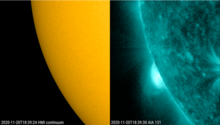 Several active regions were visible in EUV at the Sun's east limb, but only one actually displayed sunspots while rounding the limb.