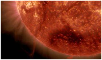 The largest coronal hole of the year appears near the Sun's south pole early December. It is so large that the total area of 650 Earths would be needed cover its surface. It extends from the south pole all the way to a latitude of about -30 degrees. That was close enough to the solar equator for its high speed wind stream to cause a minor geomagnetic storm on 7 December, with solar wind speeds up to around 800 km/s.