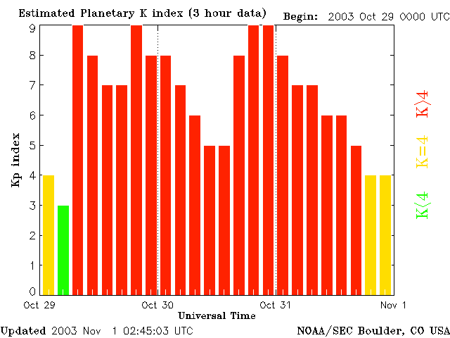 Regular space weather observers immediately noticed this was not something that occurs frequently. A closer look was taken at the Kp values available at the World Data Center for Geomagnetism in Kyoto (http://wdc.kugi.kyoto-u.ac.jp/kp/index.html ), which has data since 1932. Any period with a Kp of 5- or higher was considered as geomagnetic storming. Note the Kyoto values may differ slightly from NOAA's daily estimated Kp (http://www.swpc.noaa.gov/products/planetary-k-index ), but it's not changing much the general conclusions.