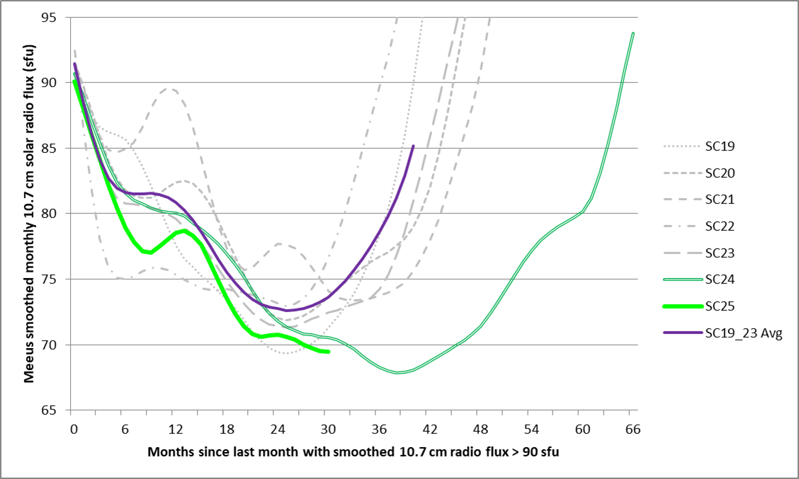 The graph above shows the smoothed monthly radio flux for the previous transits of solar cycles 19 thru 23 (SC19, ... , SC23 - grey lines), with the average evolution in the thick purple line. Month "0" corresponds to the last month when the radio flux was above 90 sfu (solar flux units - see link to the newsitem above). The double green line is the smoothed evolution of the previous cycle transit (SC24), and the thick fluo-green line is the current evolution of the radio flux. It's clear that the evolution towards SC25 is gradually starting to be more similar to the evolution of the previous solar cycle (SC24), and to deviate more from the 5 solar cycles before that. IF the current evolution of the smoothed radio flux continues to mimick that of the previous solar cycle transition (SC24), then a cycle minimum can be expected somewhere around August 2019. Note a healthy error margin is appropriate, as there's a 4 month uncertainty for the radio flux timing, and -as stated before- a potential 2 month difference with the sunspot cycle minimum. Of interest too is that a similar approach for the International Sunspot Number (ISN) puts the minimum in January 2020. This means that both timings for the solar cycle minimum fall in the first half of the prediction range announced by the international SC25 prediction panel a few months ago (see this STCE Newsitem).