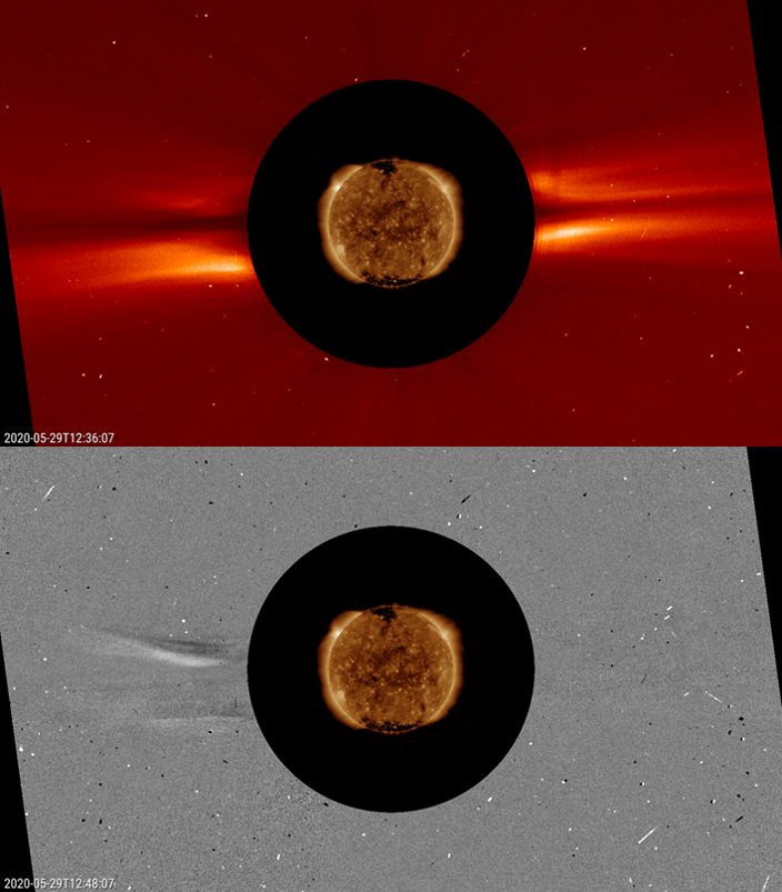 Not only the strength of the two flaring events are very similar, also the outlook of both eruptions was a close match. The SUVI instrument (Solar Ultraviolet Imager) onboard the GOES-16 satellite recorded some impressive images from these eruptions (below). In both instances, the event starts out as the typical balloon-like eruption billowing away from the Sun. The imagery then clearly shows how the northern part seems to bump into the fanning, overarching magnetic field of the Sun's northern polar coronal hole, getting deflected towards the east ("left") as if it had hit a brick wall. Consequently also the resulting CMEs had a very similar (and very deformed) outlook, as can be seen in the SOHO/LASCO C2 images.