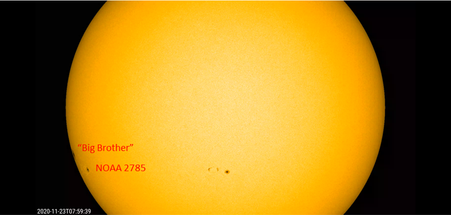 The imagery underneath covers the period from 22 November until 23 November at noon and shows the Sun in white light (SDO/HMI). It shows a sunspot region (NOAA 2784) decaying in the northern solar hemisphere, another region developing in the trailing portion of NOAA 2783 in the southern hemisphere, and two sunspot regions rotating over the southeast solar limb (lower left). The first one starts appearing early on 22 November and was numbered NOAA 2785, whereas its big brother starts becoming visible early on 23 November and still needs to receive a number. In particular this latter group is impressive, while it still has not fully rotated over the solar limb yet. It currently consists of a big single sunspot which has a diameter of 3 degrees, corresponding to nearly the circumference of the Earth.