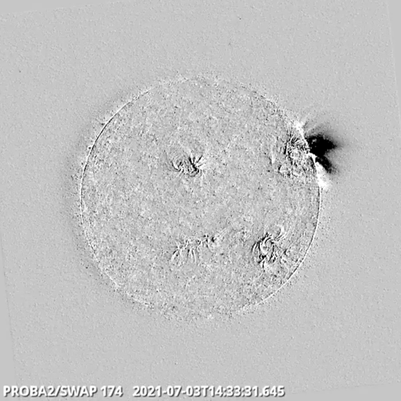 An X1.5 flare was produced on 3 July (peak at 14:29UT) by a region that started to develop only late on the previous day. Its location was very close to the northwest limb making an accurate assessment of its magnetic complexity difficult. At the moment of this writing, this active region NOAA 2838 has already produced 3 C-, 2 M- and 1 X-class flare (See the STCE's SWx classifications page for further info). The SDO/AIA 094 shows the flare shortly after its peak in extreme ultraviolet (EUV). Also the SWAP instrument onboard PROBA2 recorded the blast (see the difference image in EUV) .
