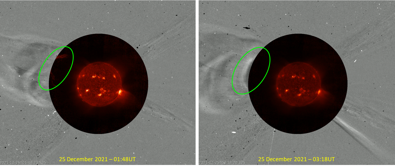Though SOHO and SolO were not observing from the same location, the separation is small enough to try and put the LASCO white-light coronagraphic pictures over the FSI EUV images. The imagery is made a bit noisy to allow tracking the ribbon simultaneously in EUV and white light in the overlap region, i.e. the coronagraphic imagery was made a bit transparent. Amazingly, by doing so, the obtained images seem to suggest that the plasma ribbon visible in EUV (FSI) also appeared in the white-light coronagraphic images from LASCO as can be seen in the annotated compilation underneath. There's a small time delay between the two, most likely due to the different perspective (about 9 degrees) or because a different part of the same structure is being imaged. The denoised version at the end of this news item shows this even more clearly. Nonetheless, this offers a great opportunity to find out more on the kinematics, true structure, and composition of this feature as it further moved away from the Sun. Also, the position of the eruption (E137 N39) seems to suggest that the associated CME went in the direction of PSP, which offers another great science opportunity, this time to match the observed CME and maybe even the plasma ribbon to in-situ solar wind measurements by PSP. It looks like this Christmas eruption is going to result in some highly interesting science papers and conference talks for many scientists. We'll keep you posted of the results!