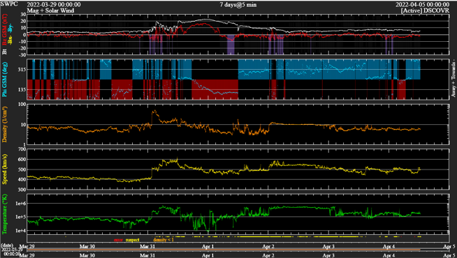 The arrival time of the resulting interplanetary CME structure (shock at 01:41UT on 31 March; DSCOVR) nicely corresponded with the predictions, but the intensity of the ensuing geomagnetic storm was rather disappointing, with only a minor storm (Kp=5) recorded in the Kp index instead of the anticipated Kp=7. Though the solar wind speed (yellow curve) lived up to expectations reaching 600 km/s, Bz (red curve) certainly did not. Bz was only weakly negative and reached briefly -12 nT. That's way too low a value for creating a potent geomagnetic storm. As the solar activity is stil ramping up to its solar cycle maximum, future storms may be a lot stronger and leave a more distinct signature.