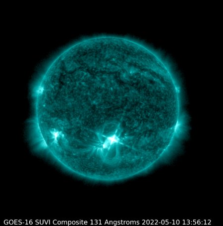 One can see this from the overall magnetic structure of the original region, which is typical for active regions in the southern solar hemisphere: red (negative polarity) leading and blue (positive polarity) trailing. It is not unusual that magnetic flux of opposite/mixed magnetic polarity emerges in these magnetic remnants (the region still has some "fuzz"), which then usually leads to some flaring activity. In this case, the sunspots seemed quite small to initiate major flaring activity, but as it happens, this active region NOAA 3006 just produced an impulsive X1.5 flare peaking at 13:55UT today 10 May. See the attached image (GOES/SUVI 131). As the x-ray emission of the flare affects the inner portion of Earth's ionosphere, radio blackouts at high frequencies were -once again- most likely experienced over the Atlantic, West-Europe, West-Africa, and the northeast of South-America (map DRAP).
