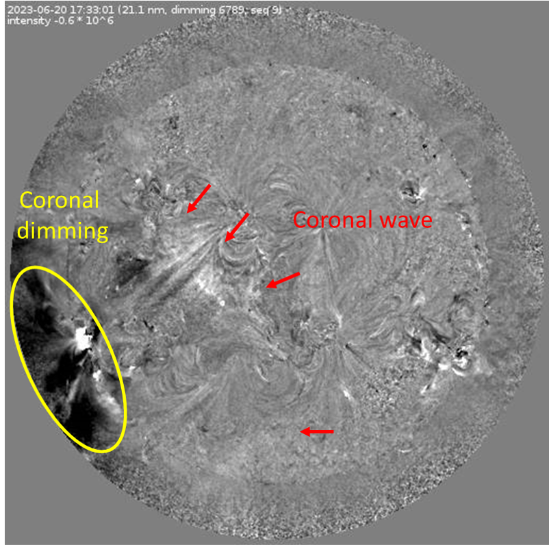 The clip (SDO/AIA 094 ; multi-million degrees) shows the evolution in this area from around 2 hours before to 1 hour after the flaring event. The blooming and diffraction patterns in the EUV images are image artefacts, not related to the flare - See this STCE newsitem for more info). Some coronal dimming and an EIT wave can be seen using the Solar Demon tool (SIDC ; annotated image).