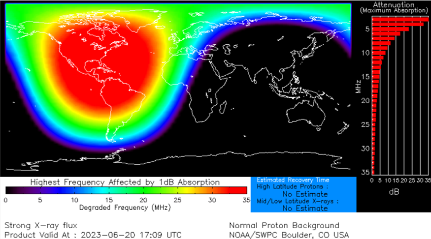 Modestly enhanced radio bursts were observed at GNSS (RSTN ; NOAA/SWPC) and other radio frequencies. The reported burst value of 480 sfu near the solar radio flux frequency of 2.8 GHz (10.7cm radio flux) confirms the event as a Tenflare and is likely to affect the noon-recording (20:00UTC) by Penticton. The map underneath (D-RAP) shows that the soft x-ray and EUV emission from this flaring event may have resulted in a radio black-out affecting HF radio communications over mainly over Canada, the United States, Latin-America, and most of South-America up to Brasil. An advisory for civil aviation has been issued (PECASUS). Further strong flaring from this active region is possible.