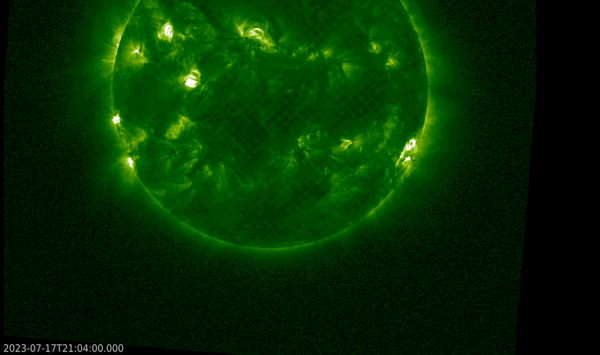 NOAA 3363, a large sunspot that has been dominating the solar disk for the last 2 weeks, was the source of an M5.7 flare peaking at 00:06UTC on 18 July (GOES). The eruption was preceded by an M2.7 (22:54 UTC) and a C7.4 (22:32UTC) flare produced by the same active region. A coronal mass ejection (CME) was associated with both the M2 and M5 flaring events, with the much faster second CME (1100 km/s according to CACTus) very quickly catching up with the first one, already when passing through the SOHO/LASCO C2 field of view. Due to the location of NOAA 3363 near the southwest solar limb, the bulk of this CME is directed away from Earth, however an earth-directed component may still deliver a glancing blow late on 19 July. Only a minor to moderate geomagnetic storm is expected. The imagery underneath shows the eruptions in extreme ultraviolet (EUV) as recorded by the GOES/SUVI instrument in respectively the 30.4 nm passbands (orange; temperatures around 80.000 degrees) and 9.4 nm (green; temperatures of multi-million degrees). In the last clip, the EUV imagery by SUVI is overlaid by coronagraphic imagery from SOHO/LASCO C2 and C3 showing the resulting bright CME. Note the C3 images are only available from 00:00UTC onwards.