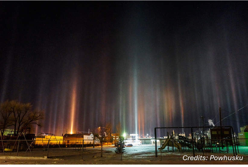 A light pillar is an atmospheric optical phenomenon in which a vertical beam of light appears to extend above and/or below a light source. The effect is created by the reflection of light from tiny ice crystals that are suspended in the atmosphere or that comprise high-altitude clouds (e.g. cirrostratus or cirrus clouds ; 2-6 km). Unlike a light beam, a light pillar is not physically located above or below the light source. Its appearance as a vertical line is an optical illusion, resulting from the collective reflection off the ice crystals. Since they are caused by the interaction of light with ice crystals, light pillars belong to the family of halos. The crystals responsible for light pillars usually consist of flat, hexagonal plates, which tend to orient themselves more or less horizontally as they fall through the air. Each flake acts as a tiny mirror which reflects light sources that are appropriately positioned below it, and the presence of flakes at a spread of altitudes causes the reflection to be elongated vertically into a column. The larger and more numerous the crystals, the more pronounced this effect becomes (Wikipedia). The image below shows a series of light pillars over Laramie, Wyoming (USA) on 20 April 2013 (Powhusku), creating the impression of curtain-like aurora. More images are at Atmospheric Optics (old site) and e.g. APOD.