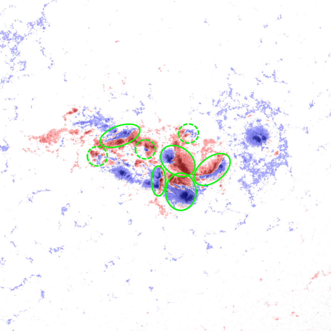 Solar flare activity remains high with 2 X1.0 flares early on 8 May. The first X-class flare peaked at 01:41UTC and was produced by NOAA 3663 (located near the northwest solar limb), responsible for all the X-class flaring since last week. The major delta magnetic structure seems to be dissipating, and so the likelihood on another major flare from this region to be decreasing. The second X1.0 flare was produced by NOAA 3664, located near the central meridian in the southern solar hemisphere. This region has dramatically increased in size and magnetic complexity since 6 May, as can be seen in the clip underneath (6-8 May ; side-by-side). It shows a semi-transparent magnetogram overlaid on white light images of NOAA 3664. Red indicates positive magnetic polarity (field lines coming out of the Sun), blue represents negative magnetic polarity (field lines returning into the Sun). The continuous emergence of magnetic flux on several locations in the trailing portion of this region has resulted in no less than 5 major and 3 weak delta structures (annotated image). Further strong flaring is possible during the coming days.