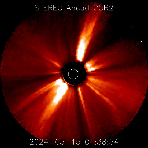 While rounding the Sun's west limb, NOAA 3664 continued to produce X-class flares (STCE newsflash ). The eruptive activity from this active region will stop for sure during the next 24 hours, as the region will be too far beyond the solar limb to produce any x-rays to be recorded by earth-orbiting satellites. No worries, a new active region has shown up near the Sun's east limb producing already an X-class flare from its own. The region, so fresh it hasn't actually gotten a number yet by NOAA/SWPC, generated a potent X2.9 flare peaking on 15 May at 14:38UTC (GOES ; chart). In the clip underneath (SDO), white light images (left) show the leading sunspots from this active region, while extreme ultraviolet (EUV) images (right) show the Sun at multi-million degrees (SDO/AIA 131). The strong blooming and diffraction patterns that can be seen in the SDO/AIA 131 images on the right are instrumental (more information is in Note 1 of this STCE newsitem).