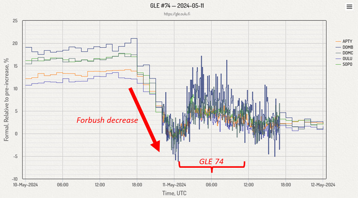 In terms of solar radiation storms, NOAA 13664 was a bit of a bummer with only 3 moderate proton events. The greater than 10 MeV proton flux reached a maximum of only 207 pfu on 10 May. However, associated with another strong X5.8 solar flare produced by NOAA 13664 early on 11 May, the greater than 100 MeV proton flux rose to 7 pfu. That was sufficient for a Ground Level Enhancement (GLE), only the second so far this solar cycle and number 74 since the measurements started back in the 1940s (Oulu). The graph underneath shows the small bump in the neutron count, which happened right during the raging geomagnetic storm of 10-11 May. The drop prior to the GLE is called a "Forbush decrease" and is the result of the passing CMEs responsible for this geomagnetic storm. They provide a strong magnetic shield against the cosmic ray particles from outside our solar system. GLE 74 will certainly not be remembered for being particularly strong. More info on GLEs in the STCE newsitems here and here.
