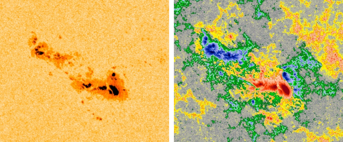 NOAA 3842 rotated over the southeast solar limb on 27 September, gradually growing in size and complexity. It developed an important magnetic delta structure in its leading spot as shown in the white light image and magnetogram underneath resp. left and right (SDO).