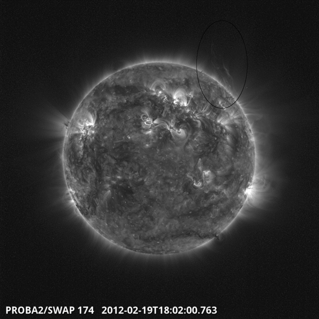 Several filament eruptions occurred in the past week: on Feb. 16 around 20:44 UT on the northwest limb, on Feb. 17 at 00:12 UT on the northwest limb and a second one in the SW quadrant around 06:12 UT, on Feb. 19 at 16:44 UT in the northwest. A CME towards the northwest was associated with this last event, which is not expected to be geo-effective.