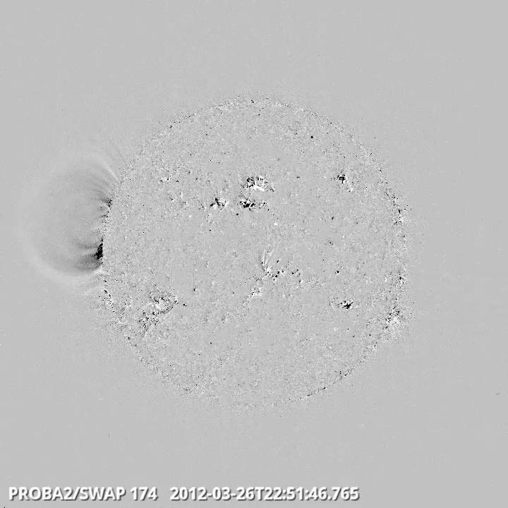 Eruption on the East limb, 26/03 @ 22:49 - probably originating from the back of the Sun - image taken from SWAP difference movie - http://proba2.oma.be/swap/data/mpg/movies/20120326_swap_diff.mp4