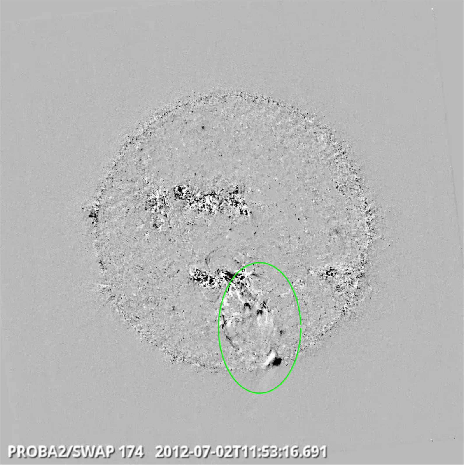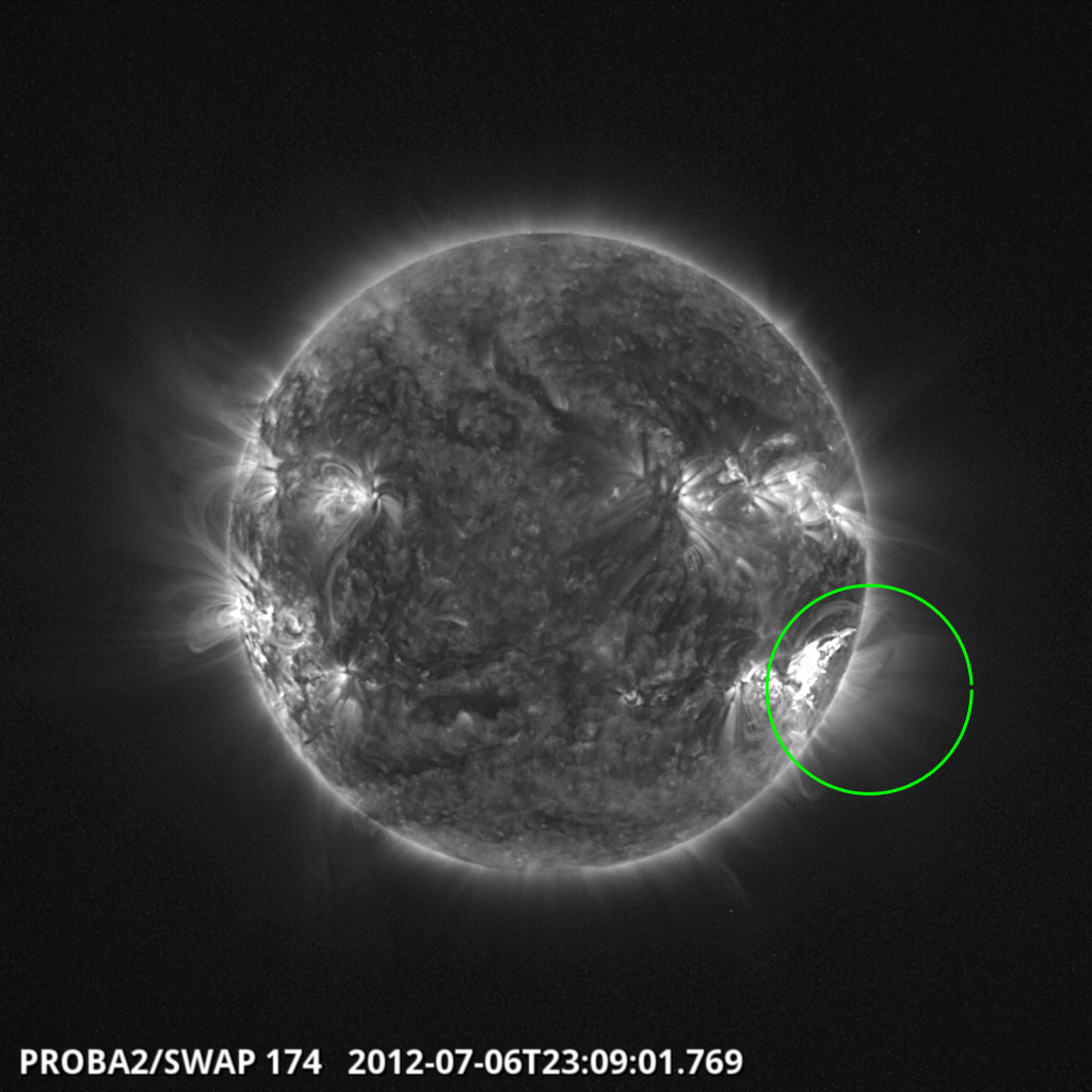 Finally, the PROBA2-team combined images from 3 satellites (PROBA2, SDO and SOHO: http://sohowww.nascom.nasa.gov/ ) into a movie showing the flare and the subsequent CME as it traveled through the Sun's corona. The movie can be seen at http://proba2.oma.be/swap/data/mpg/movies/campaign_movies/2012_07_07_10_49_44_2012_07_09_10_22_20_SWAP_174__LASCO_C2__AIA_304-hq-1.mp4 Underneath are 3 stills from this clip. The first image shows the flare at 16:38UT, with material visibly leaving the solar surface. The second image was taken around 18:50UT, clearly showing how the solid CME from the flare is leaving the Sun. Interestingly, the third image taken around 22:10UT, shows that a second CME was hurled into space. The particle cloud originated from the eruption of the trans-equatorial coronal arch visible in the first two images. Amazingly, the arch would reshape itself a few hours later and remained visible for another two days!