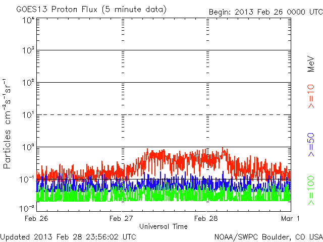 The GOES proton flux (>=10 MeV) levels increased for 24hours starting around Feb 27 05:00 UT but did not cross event thresholds.