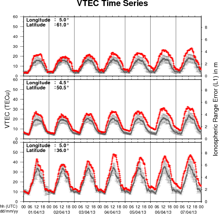 The figure shows the time evolution of the Vertical Total Electron Content (VTEC) (in red) during the last week at three locations: