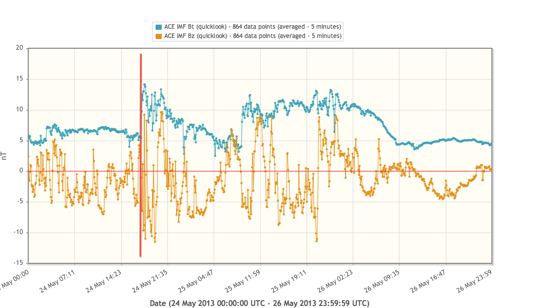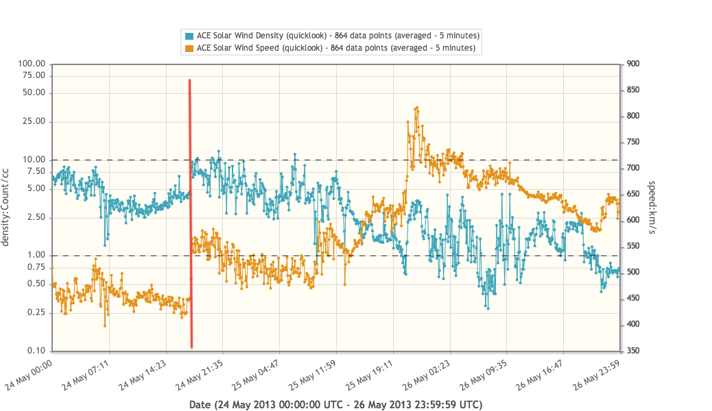 Geomagnetic activity was quiet (K below 3) to moderate (K below 4) except from May 24th around 18:00 UT until May 26th around 21:00 where storm levels were recorded (K higher or equal to 5) due to the arrival of the CME of May 22. A shock was seen in ACE data on May 24, around 18:00 UT causing a rise in solar wind speed, solar wind density and total interplanetary magnetic field strength. Bz fluctuated between 10nT and -12nT. This is indicated with the red line in the two graphs below. On May 25, the solar wind speed peaked even around 800 km/s.