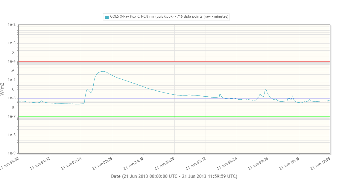 During the early hours of 21 June, the relatively simple sunspot group Catania 10/ NOAA AR 1777 unleashed a medium class solar flare. The M2.9 flare peaked at 03:14UT, and lasted for 73 minutes. Its x-ray signature clearly dominated the x-ray solar activity for that day.