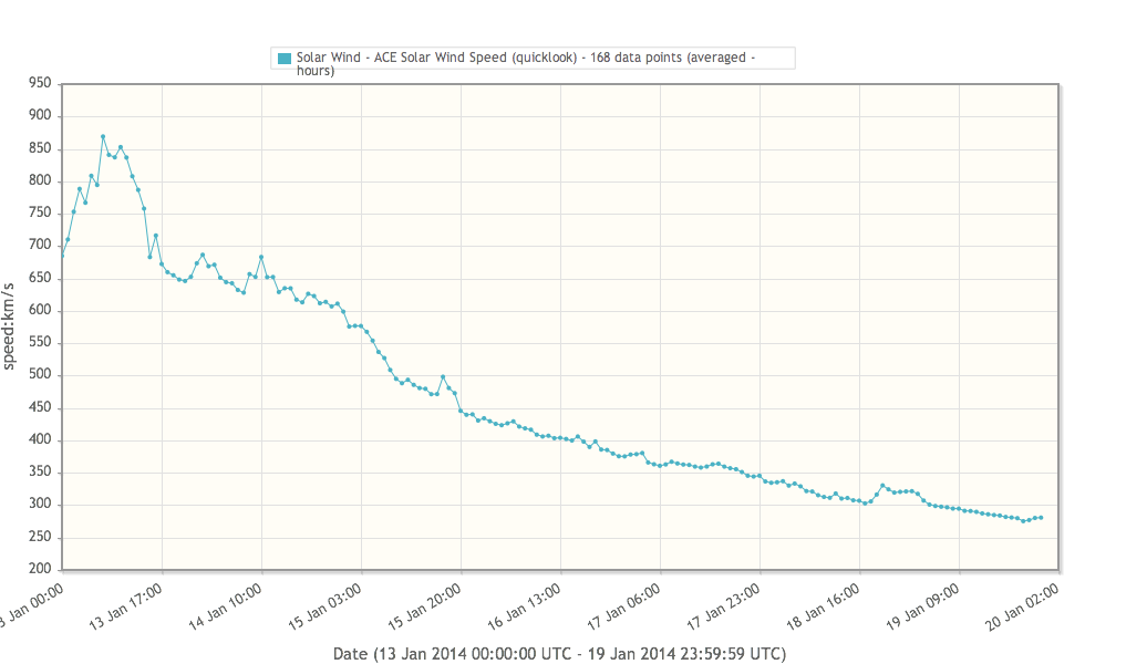 At first, the Earth was inside a fast solar wind associated with the extended (in latitude and in longitude) coronal hole in the northern hemisphere which first reached the central meridian on January 8. The solar wind speed reached a maximum value of about 870 km/s on January 13. The interplanetary magnetic field reached a maximum value of about 10 nT on that day. The interaction region between the slow and fast solar wind and the actual high speed stream emanating from the coronal hole high speed stream did not result in disturbed geomagnetic condition.
