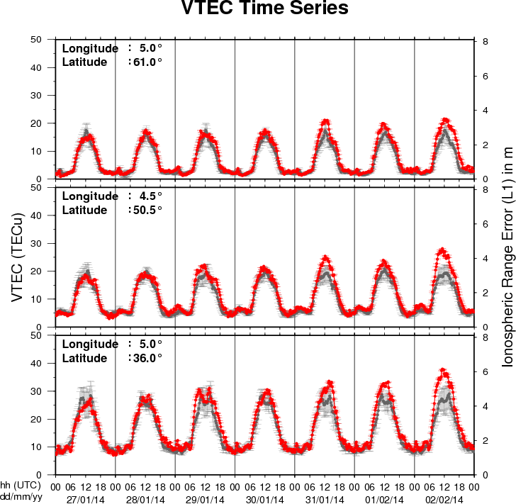 The VTEC is expressed in TECu (with TECu=10^16 electrons per square meter) and is directly related to the signal propagation delay due to the ionosphere (in figure: delay on GPS L1 frequency).