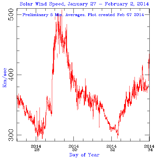 Solar wind speed varied mostly between 300 and 350 km/s. On 28 January around 20:30UT, solar wind speed changed from about 330km/s to 450-500 km/s. The high temperature, low density stream had a Bz varying between -7 and +7 nT. The source of this high speed stream was most probably a small coronal hole that passed the central meridian on 25 January.