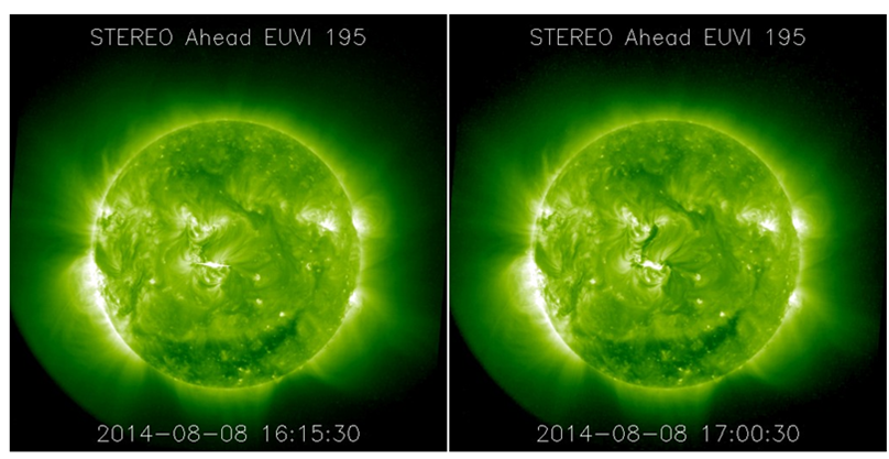 A movie of the 8 August 2014 event, showing EUV images from STEREO-A and coronagraphic images from SOHO and STEREO-A, can be found at http://youtu.be/6tfDrDHYudw Further reading on estimating the strength of flares from STEREO EUV images is at the Solar Physics website (http://adsabs.harvard.edu/abs/2013SoPh..288..241N).