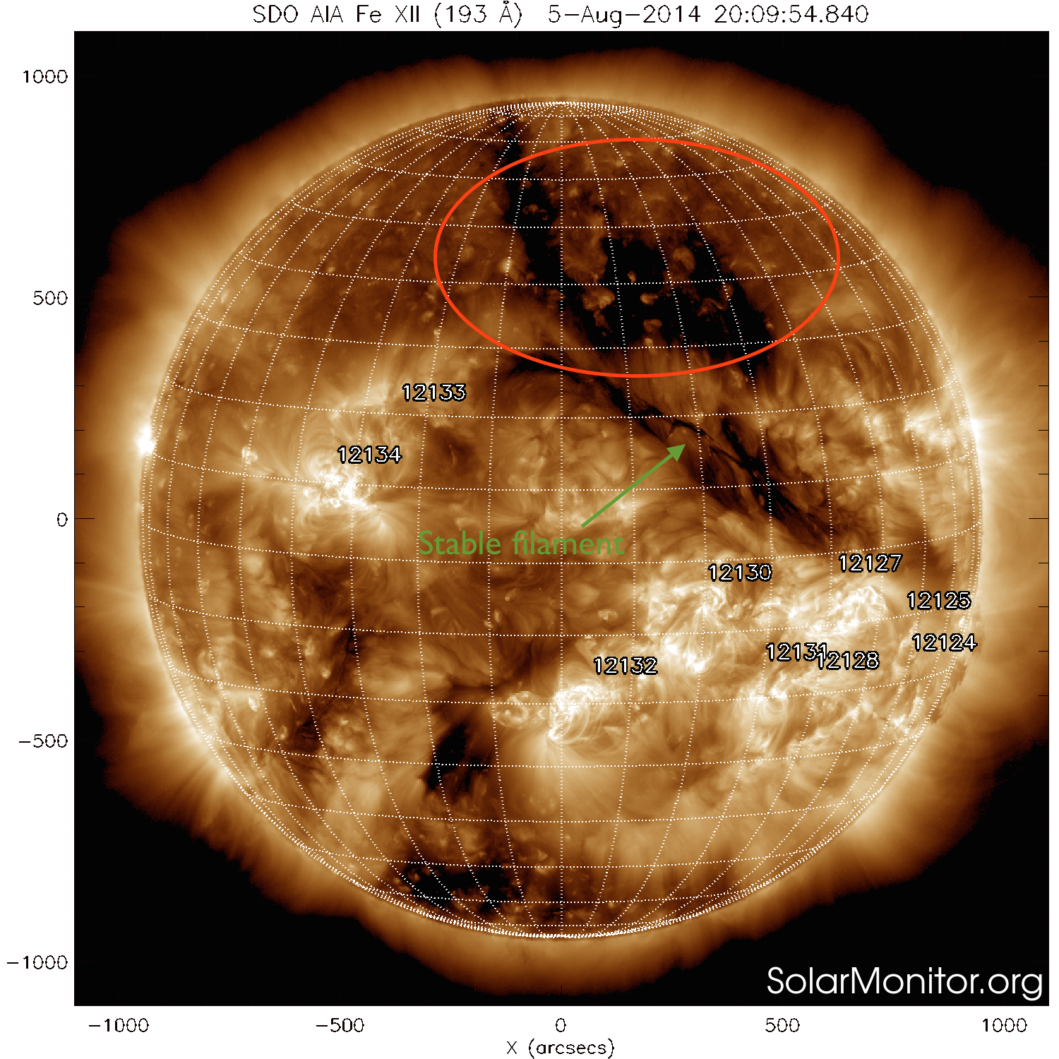 At the time of its rounding of the west limb on 3 August, the group seemed stable and even declining. It showed also some magnetic connection with NOAA 2121 in the northern hemisphere, as can be deduced from the faint trans-equatorial loops over the west limb as seen in extreme ultraviolet (EUV) images from SDO (1-2 August).