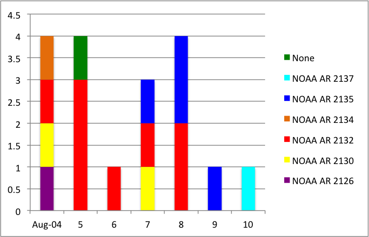 No earth-directed CMEs were observed in the past week. A type II radio burst was observed in Humain on August 5 at 15:50. It was related to a C1.1 flare at location N11E51 (close to NOAA AR 2134 - green in the above chart, the source region is labeled as None because it could not be linked to an active region) and to a narrow CME observed by LASCO at 16:24 UT towards the north-east.